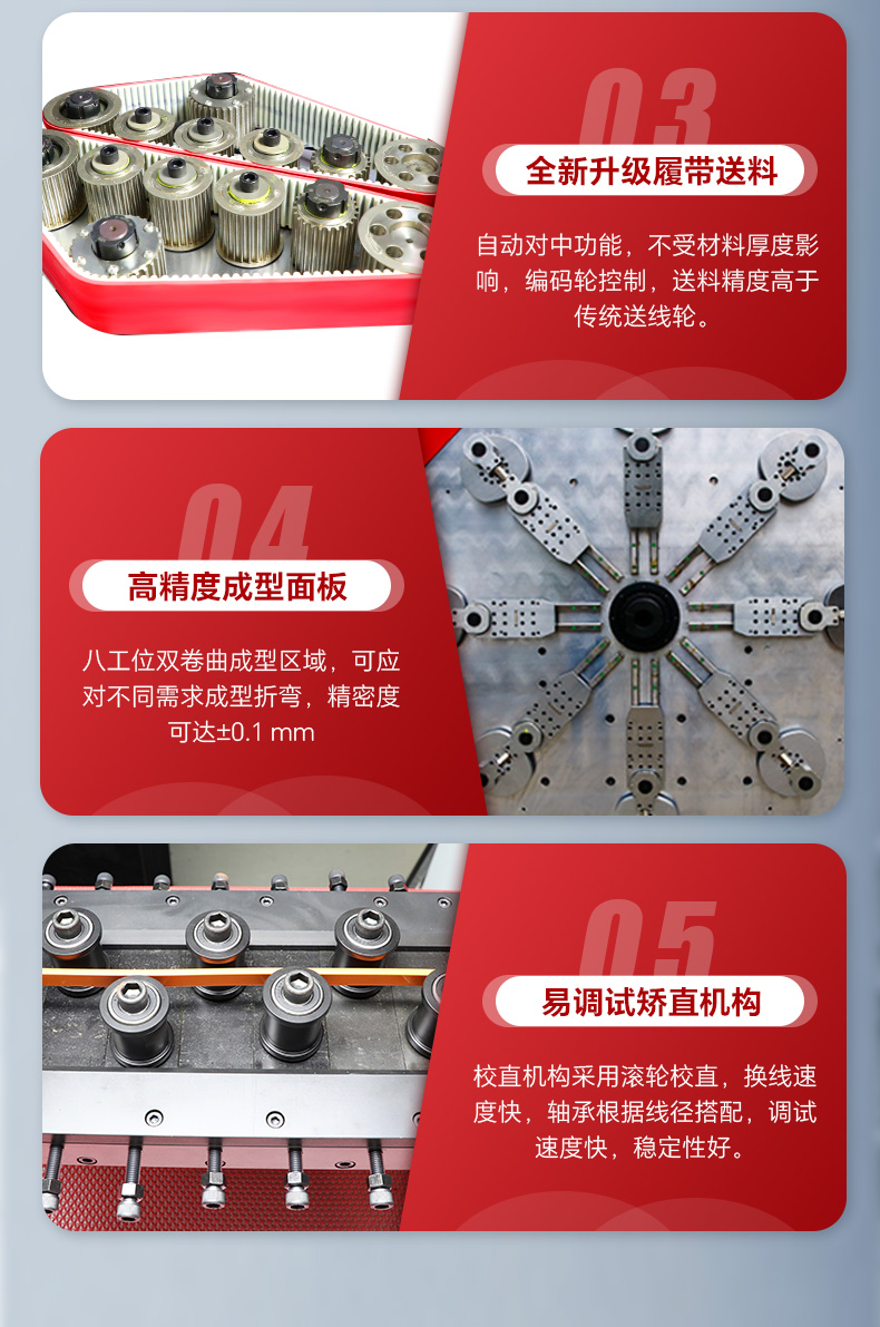 3.履帶送料,具備自動對中功能,不受材料厚度影響,直接使用;同時安裝編碼輪控制,送料精度高于傳統送線輪。